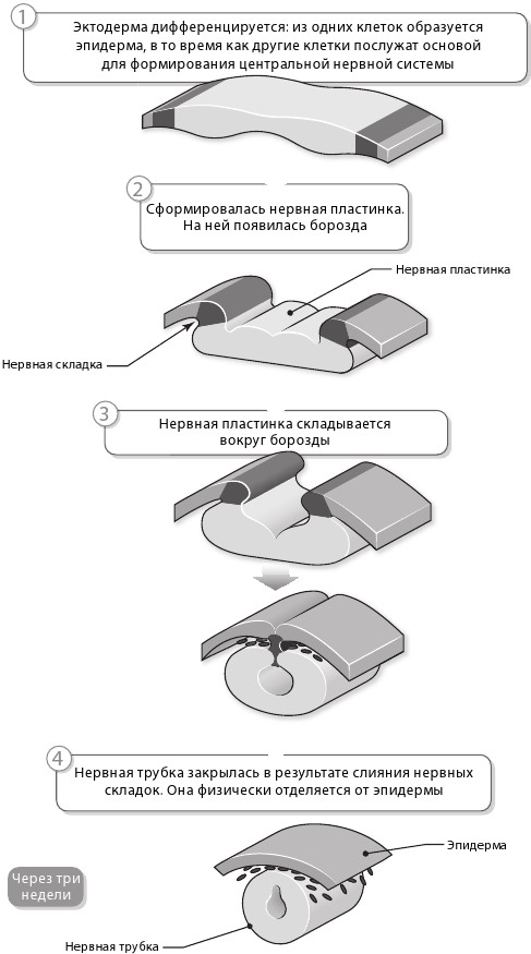 Внутриматочное развитие центральной нервной системы у человека проходит через несколько основных этапов. Как и у всех позвоночных, эмбрион развивается из трех зародышевых листков (от внутреннего к наружному: эндодерма, мезодерма, эктодерма). Центральная нервная система образуется из эктодермы, которая на третьей неделе после зачатия утолщается и складывается в нервную пластинку, а та, в свою очередь, сворачиваясь, формирует нервную трубку (рисунок 3). Затем эта трубка сегментируется, и ее передняя часть образует три мозговых пузыря, которые дифференцируются для формирования структур мозга (рисунок 4). В конце этого сложного цикла мозг покрывают шесть слоев коры больших полушарий, которая есть только у млекопитающих.