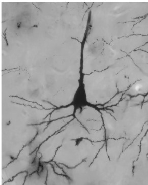 7. Изображение, сделанное с помощью окрашивания Гольджи. На иллюстрации представлены клеточные тела, центральная часть нейрона, получающие информацию дендриты (разветвленные волокна вокруг ядра) и аксон (длинный вертикальный отросток), который передает эту информацию