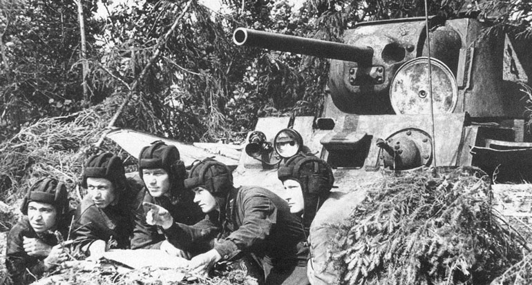 Тяжелый танк КВ-1 на замаскированной боевой позиции. Брянский фронт, лето 1942 года