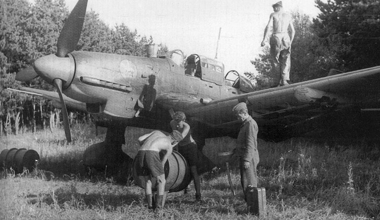 Подготовка к вылету пикирующего бомбардировщика Ju 87D-1. Восточный фронт, лето 1942 года