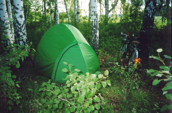 Как-то неожиданно дорога пошла в слабый, но чувствительный уклон. Проезжаем двадцать километров и где-то перед поворотом в село Мамлютка сворачиваем в берёзовую рощу. Ставим палатку, ужинаем. Самый обычный вечер.