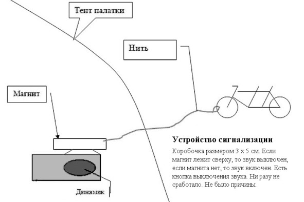 Маловероятно, что кто-то его уведёт, но делается это не только для самоуспокоения. Маловероятное событие, если оно происходит, то чаще всего решающим образом влияет навесь ход дальнейших событий. Одного такого «маловероятного» нам может стать вполне достаточно для того, чтобы наше путешествие прекратилось. Поэтому делаю так, что если вдруг ночью кому-то понадобится тандем, то этому индивидууму придётся разобрать кучу веток, что вызовет звуки, от которых мы проснёмся. А если тандем сдвинуть с места, то включится сигнализация. Издаваемый ей звук громкий.