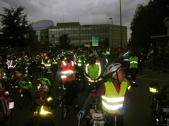 Ставим тандем у стенки. Наблюдаем, как на дорожке стадиона формируются первые группы из марафонцев, стартующих в 20.00. Техосмотр выборочный. Проверяют чаще всего тех, кто становится в стартовую группу в числе последних. В первую очередь просят включить всё имеющееся освещение. Обращают внимание на то, чтобы велосумки и прочие предметы не загораживали световой поток. Все без исключения велосипедисты одеты в куртки со светоотражающими лентами.