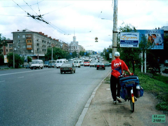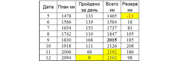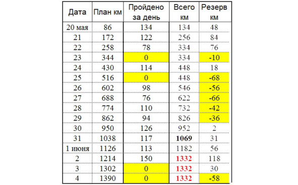 План – 86 километров в день. Из 16 дней 4 дня отдыха в Тольятти, Самаре и в Челябинске и один неполный ходовой день перед Тольятти. Отстаём от графика на 58 километров.