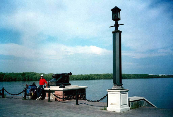 Корабельная пушка установлена на постаменте в месте, где начинался город Омск.