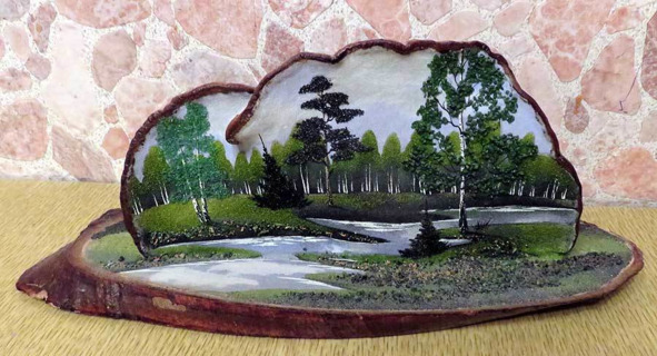 Лесной пейзаж Урала, искусно выложенный из крошки уральских самоцветов, нанесённой на срезы ствола дерева.