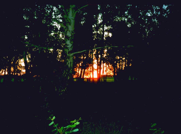 Закатное солнце в последний момент уходящего дня пробило тучи и полыхнуло по берёзовым стволам оранжевым огнём.