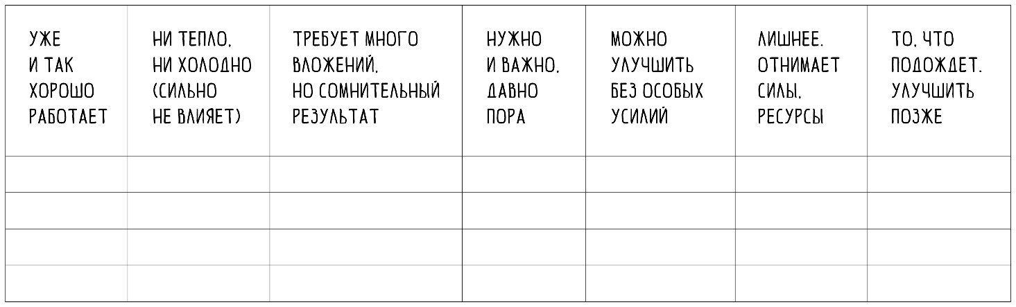 Нарисуйте таблицу. В ячейках пропишите, что у вас сейчас работает, что вообще не работает и то, что требует только небольших перемен. Пишите конкретные вещи. Это касается и конкретных услуг, и конкретных действий. Опишите все, что сможете.