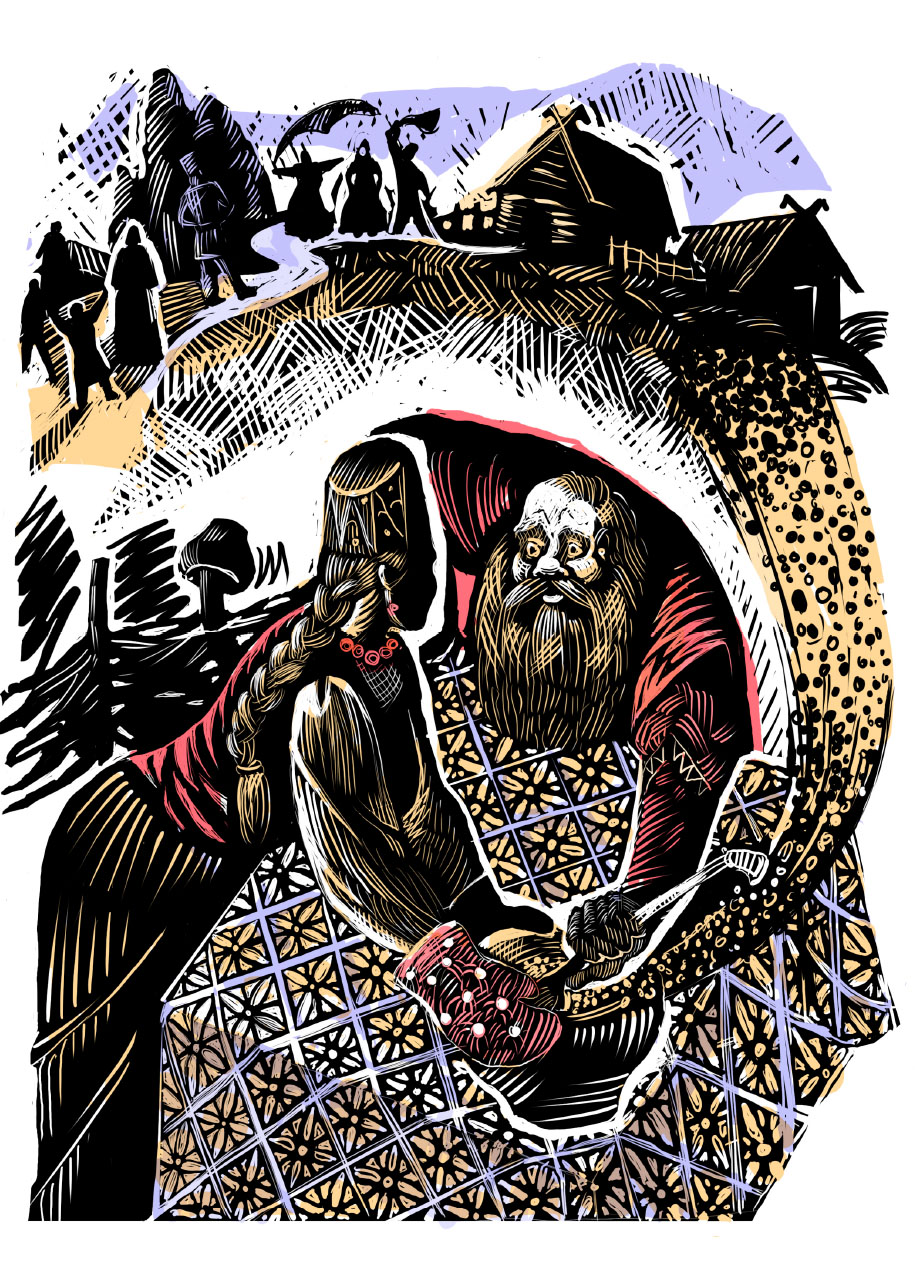 Вошел в дом, а его как жданого с хлебом-солью встречают, чаркою водки чествуют, говорят слово красное, просят присесть и скамью, крытую бархатом, становят ему, и под ноги скамеечку; и вызывают девицу красную, и она бежит, спешит и садится возле, а не супротив, и сама его расспрашивает, что завело к ним царевича?