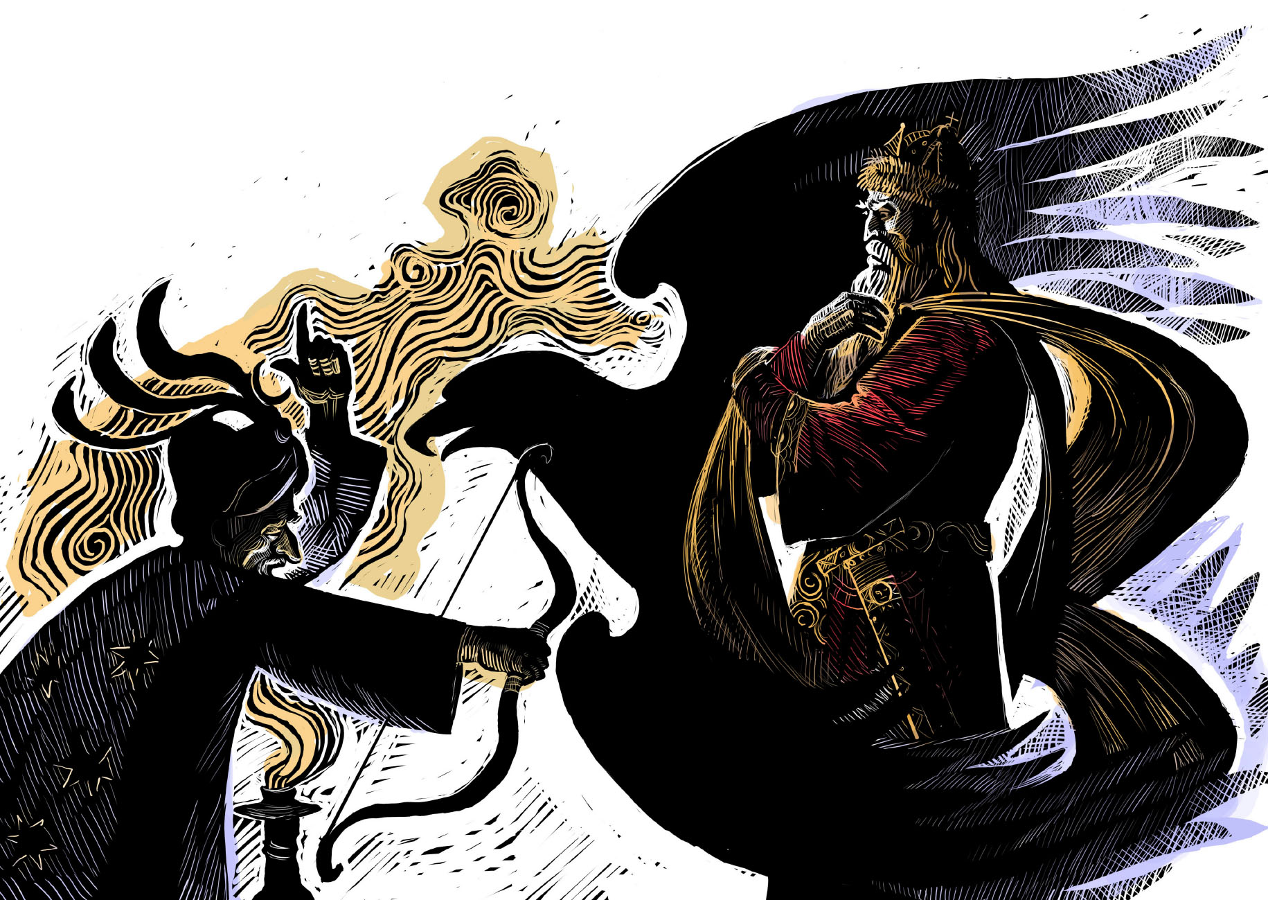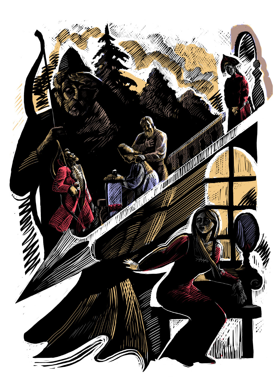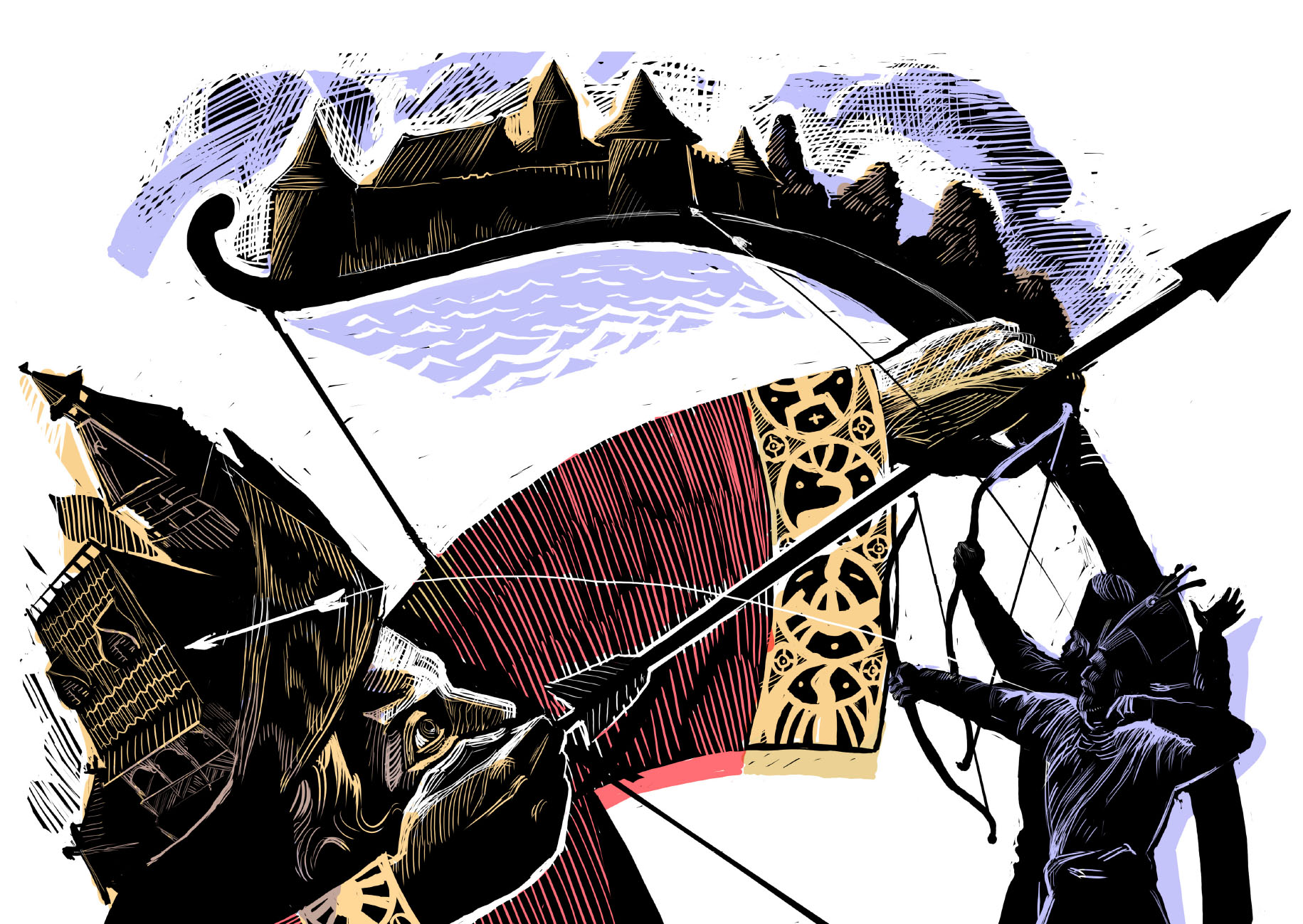 Призвали царевичей к отцу, Тафуте-царю. Объяснил им мудрец мудрую затею свою, и они, царевичи, поперек слова не молвили. А мудрец седой отвел их на место высокое, на башню, что была посредине города выстроена; поставил их на три стороны, друг к другу затылком, дал по стреле да по луку и велел стрелять… «Да смотрите же, – сказал, – если кто стрелу свою не отыщет, тот не будет женат! Стреляйте, а сами смекайте, где отыскать ее».
