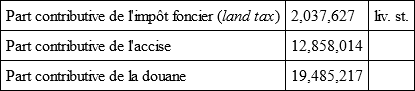 2o L'impôt foncier est demeuré invariable depuis cent cinquante ans, quoique la rente des terres ait septuplé. Il n'entre que pour un vingt-cinquième dans les recettes publiques.