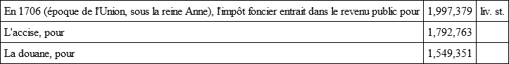 Et il faut considérer que, dans ce laps de temps, la rente des terres ou le revenu du propriétaire a augmenté dans la proportion de 1 à 7, en sorte que le même domaine qui, sous la reine Anne, acquittait 20 pour 100 de contributions sur le revenu, ne paie pas aujourd'hui 3 pour 100.