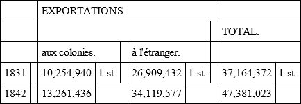 Aux deux époques, le commerce colonial n'entre que pour un peu plus du quart dans le commerce général. – L'accroissement, dans onze ans, est de trois millions environ. Et il faut remarquer que les Indes orientales, auxquelles ont été appliqués, dans l'intervalle, les principes de la liberté, entrent pour 1,300,000 liv. dans cet accroissement, et Gibraltar, – qui ne donne pas lieu à un commerce colonial, mais à un commerce étranger, avec l'Espagne, – pour 600,000 liv. sterl.; en sorte qu'il ne reste pour l'augmentation réelle du commerce colonial, dans un intervalle de onze ans, que 1,100,000 liv. sterl. – Pendant ce même temps, et en dépit de nos tarifs, les exportations de l'Angleterre en France se sont élevées de liv. sterl. 602,688 à 3,193,939.