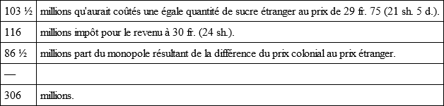 À raison de 49 fr. 20 c. (39 sh. 5 d.), plus 30 fr. de droits (24 sh.), il en a coûté au peuple anglais, pour consommer annuellement 3,868,000 quintaux de sucre, la somme de 306 millions et demi, qui se décompose ainsi: