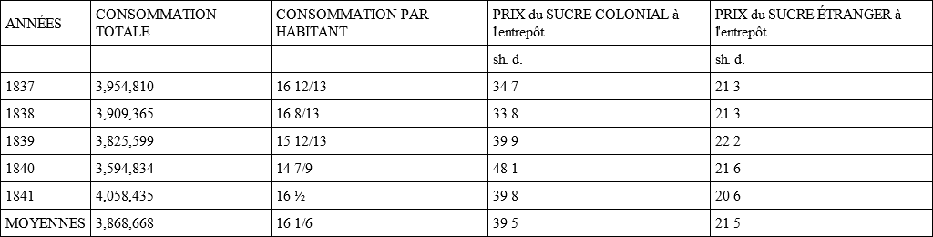 «Nous avons payé en 1840, et sans parler des droits d'entrée, 5 millions de livres de plus que n'aurait fait pour une égale quantité de sucre toute autre nation. Dans la même année, nous avons exporté pour 4,000,000 l. st. aux colonies à sucre; en sorte que nous aurions gagné un million à suivre le vrai principe, qui est d'acheter au marché le plus avantageux, alors même que nous aurions fait cadeau aux planteurs de toutes les marchandises qu'ils nous ont prises.»