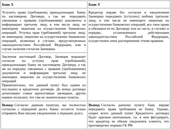 Исходя из данного постановления, если в кредитном договоре отсутствует пункт о возможности банка уступить долг лицу, не обладающему статусом кредитной организации и в кредитном досье нет согласия от заемщика на данную операцию, то суд признает договор цессии ничтожным. (согласно п. 2 ст. 388 ГК РФ, статье 26 «Банковская тайна» Федерального закона от 2 декабря 1990 г. №395—1 «О банках и банковской деятельности»). Примером тому может служить апелляционное определение Белгородского областного суда от 19 августа 2014 г. №33—3346/2014, определение Санкт-Петербургского городского суда от 25.02.2013 №33—2819/13. Вот еще судебная практика – определение Санкт-Петербургского городского суда от 18.06.2013 №8548.