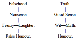 The impostor of whom I am speaking descends originally from Falsehood, who was the mother of Nonsense, who gave birth to a son called Frenzy, who married one of the daughters of Folly, commonly known by the name of Laughter, from whom came that monstrous infant of which I have been speaking. I shall set down at length the genealogical table of False Humour, and, at the same time, place by its side the genealogy of True Humour, that the reader may at one view behold their different pedigree and relations: —