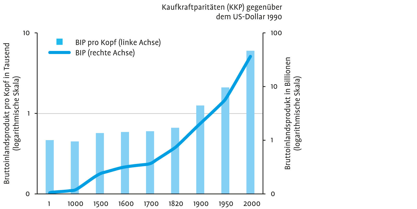 Abb. 1.1 Die Entwicklung des Weltprodukts absolut und pro Kopf in US-Dollar seit Christi Geburt (nach Maddison 2007; World Bank 2008)