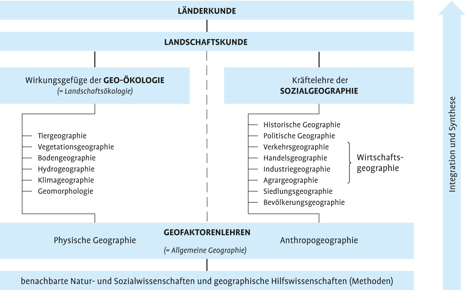 Höchstes Ziel der Länderkunde ist es, über die landschaftstypischen Wirkungszusammenhänge hinaus alle Schichten der Landschaft so zu integrieren, dass ein ganzheitliches Verständnis des Landes – gleichsam dessen Totalcharakter – erschlossen wird. Diese Zusammenschau aller Schichten gleicht einer Sicht von oben auf übereinandergelegte Folien, die alle Einzelelemente gemeinsam zum Vorschein bringt. Im Gegensatz zur Landschaftskunde gilt die Länderkunde als idiographisch, d. h. sie begreift einen Erdausschnitt nicht als Raumtyp, sondern als einmaliges Raumindividuum mit einem einzigartigen „Schicksal“. Die idiographische und synthetische Zusammenschau der Erdoberfläche zu Ländern genießt in der Länder- und Landschaftskunde allerhöchste Priorität und steht an der Spitze einer hierarchisch gedachten Konzeption der Geographie, wie sie noch 1970 von Uhlig (1970) vorgestellt wurde (→ Abb. 2.1).