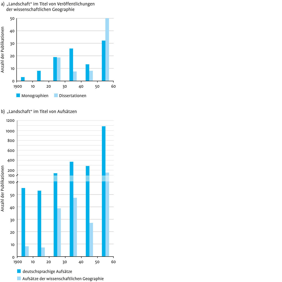 Der historische Anstieg der Zahl der Publikationen mit dem Titelbegriff „Landschaft“ macht außerdem deutlich, dass die Entwicklung eines Paradigmas wie der Länder- und Landschaftskunde nicht nur innerhalb eines Fachs begründet liegt, sondern oft durch allgemeine gesellschaftliche Denkströmungen mit bedingt wird. So lässt sich eine Zunahme des Landschaftsbewusstseins nicht nur in der wissenschaftlichen Geographie (→ Abb. 2.2 a), sondern auch in anderen Disziplinen für die erste Hälfte des 20. Jahrhunderts nachweisen (→ Abb. 2.2 b). Mit dem Beginn der methodologischen Revolution setzte jedoch seit den 1940er-Jahren eine zunehmende Kritik am länderkundlichen Denken ein (Hard 1973, 2. Teil).