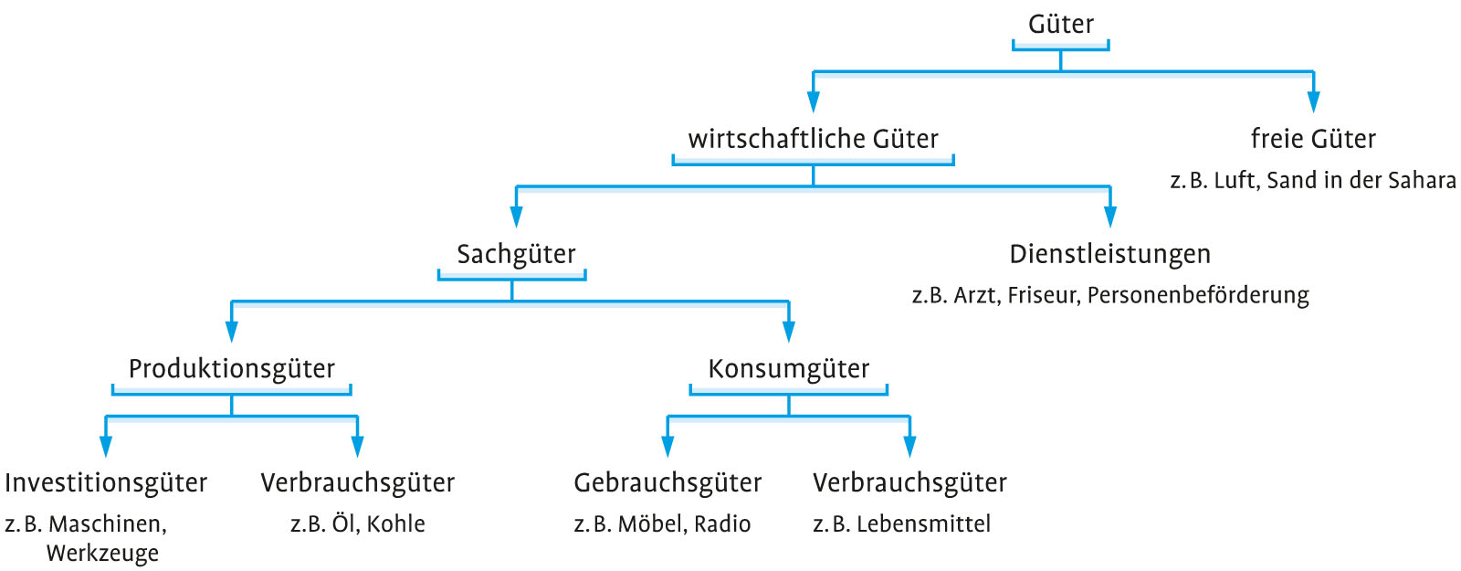 Güter schaffen dadurch einen Nutzen, dass sie Bedürfnisse befriedigen. Unabhängig von der Art des Wirtschaftssystems lassen sich dabei verschiedene Arten von Gütern unterscheiden. Je nach Perspektive und Erkenntnisinteresse werden unterschiedliche Kriterien zur Unterscheidung von Gütern herangezogen. Zunächst lassen sich freie und knappe Güter unterscheiden. Freie Güter sind unbegrenzt verfügbar, während knappe Güter begrenzt sind. Da nur für letztere ein Preis gebildet wird, gelten sie als Wirtschaftsgüter. Diese wiederum können in materielle Sachgüter und immaterielle Güter wie z. B. Dienstleistungen unterteilt werden. Des Weiteren können Konsumgüter von Produktionsgütern unterschieden werden und schließlich lassen sich Investitionsgüter im Produktionsbereich (z. B. Maschinen und Anlagen) von Gebrauchsgütern im Konsumentenbereich (z. B. Möbel) und von Verbrauchsgütern unterscheiden (→ Abb. 3.2). Aus sozioökonomischer Perspektive lassen sich bei allen Ressourcen und Gütern drei grundlegende Fragen formulieren, die aufgrund unterschiedlicher technischer und sozialer Bedingungen bei der Nutzung zu einer Differenzierung zwischen Gütern mit unterschiedlichen Eigenschaften führen (Esser 2000 a): Wie erfolgt die Produktion der Güter? Wie werden sie an die Konsumenten verteilt (Allokation)? Welche Folgen entstehen aus Produktion und Konsum für andere Akteure (externe Effekte)?