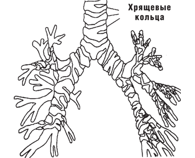 Рисунок 2. Перевернутое бронхиальное дерево со своими мелкими веточками (бронхиолами), направленными вниз и наружу, служит каркасом для бесчисленных воздушных мешочков (альвеол), в которых происходит газообмен. Хрящевые кольца, покрывающие бронхиальное дерево сверху донизу, формируют его жесткую трубкообразную структуру и одновременно обеспечивают эластичность. Нижние концы бронхиол состоят из колец мягкой мышечной и волокнистой фиброзной ткани и не содержат хрящей. У детей воздухоносные трубки меньше и их хрящевая оболочка не такая твердая. Вот почему в детском возрасте опасность полного перекрытия дыхательных путей намного выше.