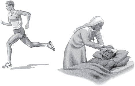 Рисунок 7. У спортсменов в период крайнего напряжения и у тяжело больных людей резко возрастает нагрузка на дыхательный аппарат, что выражается в тяжелом дыхании и увеличении амплитуды движения грудной клетки. Больных с такими проблемами дыхания в наши дни помещают в кислородную палатку или принудительно вводят им кислород через нос, чтобы облегчить процесс получения кислорода. Молодых спортсменов обычно выручает большой объем тренированных легких.