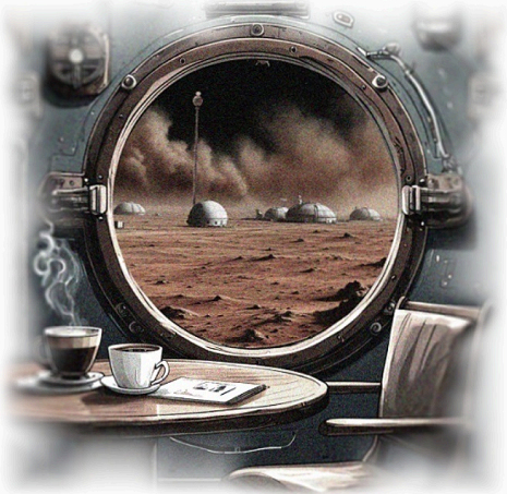 Серёжа сидел за столиком в кают-компании и потягивал какао из фарфоровой кружки. За здоровенным, больше метра в диаметре, иллюминатором (его уже просветили, что кроме прямого назначения он служит и аварийным выходом) – холмились до самого горизонта марсианские пески, терракотово-бурые из-за содержащегося в них оксида железа. У горизонта пески сливались с узкой полосой серо-жёлтого неба; выше оно наливалось темнотой и становилось чёрным, в россыпях звёзд. На фоне этой черноты неслись подгоняемые атмосферными потоками пылевые полосы – плато Большой Сырт недаром имело репутацию самого пыльного места на всём Марсе.