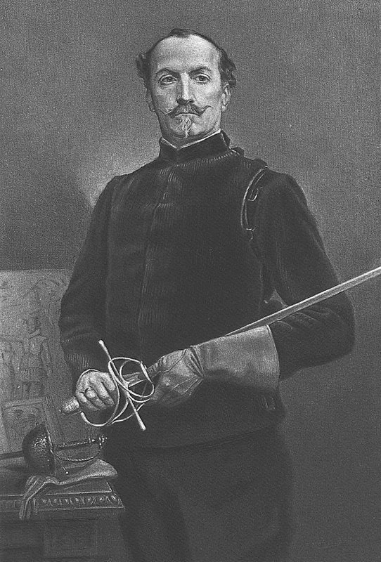 На фотографии он стоял в фехтовальном костюме девятнадцатого века. Правая рука уверенно держит шпагу с замысловатой витой гардой. ещё одна шпага лежит рядом на столе. Этакий Эскамильо! Ольгу Смольскую вполне можно понять – прям, широкоплеч, суров… Есть ли родинка – этого на зернистой фотографии позапрошлого века не видно.