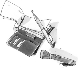 Moritz kramt in seinem Rucksack. „Notizblock und Stift haben wir schon mal. Minitaschenlampe, Fernglas und Digitalkamera sind auch da.“
