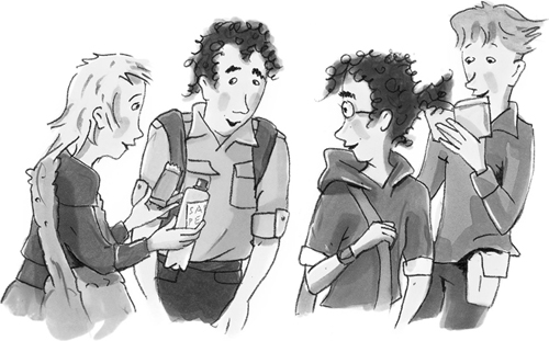 Wenig später kommen ihnen zwei Mädchen entgegen. Moritz geht auf sie zu und fragt die eine: „Kannst du mir dein T-Shirt verkaufen?“
