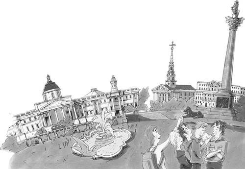 „Trafalgar Square! Hier müssen wir raus und in die Linie Elf umsteigen.“ Frau Bach zeigt auf den großen Platz mit Springbrunnen, Löwen aus Bronze und einer hohen Säule.