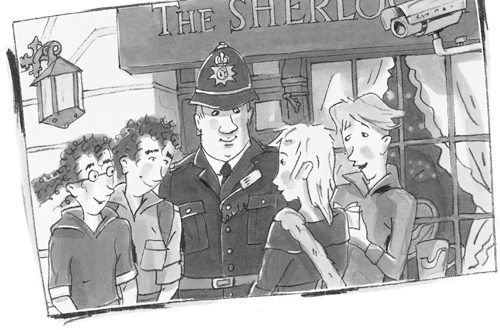 „Hallo! Wie war es im Tower?“, fragt Frau Bach. „Sehr interessant, aber ziemlich voll“, antwortet Alexander. „Ich hoffe, in dem winzigen Sherlock Holmes Museum gibt es kein Gedränge“, sagt Frau Bach. „Vor der Tür steht ein Polizist. Würdet ihr euch bitte dazustellen, damit ich ein paar Fotos schießen kann?“