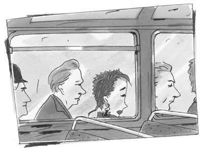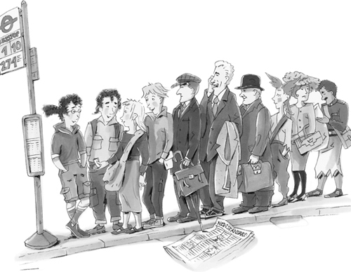 „In dem Gewimmel!“ Moritz zeigt auf die Bushaltestelle. „Schaut mal, sie stellt sich in die Warteschlange. Wo sie wohl hin will?“
