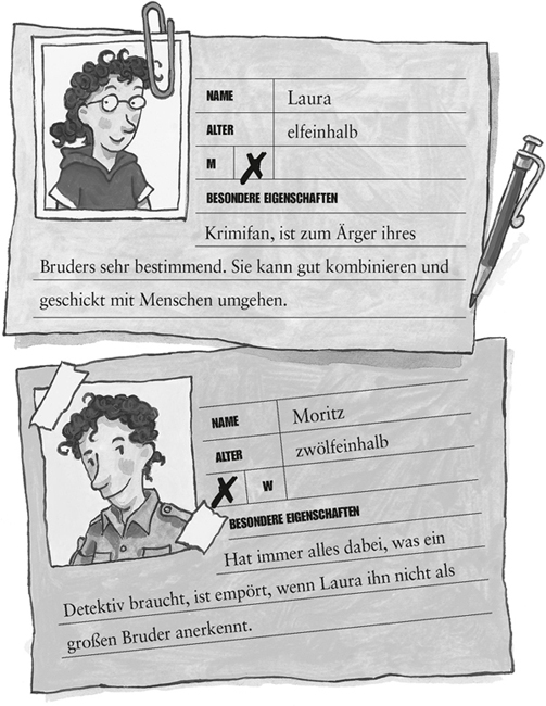 Laura knufft ihren Bruder. „Los! Moppel! Reiß dich zusammen. Detektivarbeit ist nicht immer nur spannend.“