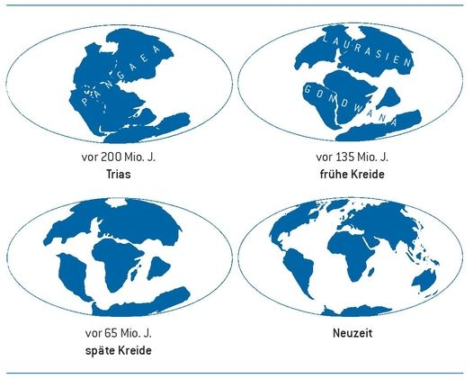 Bei der Betrachtung der Evolution verschiedener Organismengruppen muss auch berücksichtigt werden, dass die Landmasse (die späteren Kontinente) im Verlauf der Erdgeschichte sich in der Lage auf der Erdkugel, in der Größe (durch Schwankungen im Meeresspiegel) sowie im Ausmaß der Isolation einzelner Teile verändert hat (Abb. 2). Im Zeitraum, als die Landbesiedelung von zahlreichen Gruppen stattfand, gab es eine einzige Landmasse (Pangaea). Später, als die Dinosaurier verbreitet waren, trennte sich Pangaea durch plattentektonische Kräfte in Laurasien und Gondwana auf. Die nachfolgende Isolation der Kontinente trug wesentlich zur Entwicklung einzelner Gruppen bei. Ein gutes Beispiel dafür ist der Inselkontinent Australien. Nach der Auflösung Gondwanas in die einzelnen Erdteile driftete die australische Platte lange Zeit weitgehend isoliert in östlicher Richtung. Ein Kontinente übergreifender Artenaustausch konnte nicht mehr stattfinden. In der Isolation Australiens|26◄ ►27| konnten so Organismengruppen überdauern, die sonst fast überall ausgestorben sind, wie etwa die Kloakentiere (Protheria). Auch die Beuteltiere (Metatheria) konnten hier überleben und entwickelten sich zu einer artenreichen Gruppe, während es mit Ausnahme weniger Arten in Amerika auf der Erde sonst keine Vertreter dieser einstmals weit verbreiteten Gruppe mehr gibt.