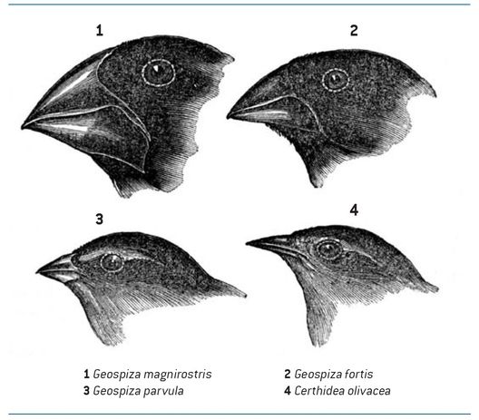 Abb. 1: Adaptive Radiation bei den Darwin-Finken auf den Galapagos-Inseln. Die unterschiedlichen Schnabelformen sind Anpassungen an verschiedene Nahrungsweisen. Alle Arten gehen auf eine einzige Stammart zurück (aus Darwin 1845, mit Bewilligung von van Wyhe J. (ed.) The Complete Work of Charles Darwin Online, www.darwin-online.org.uk).