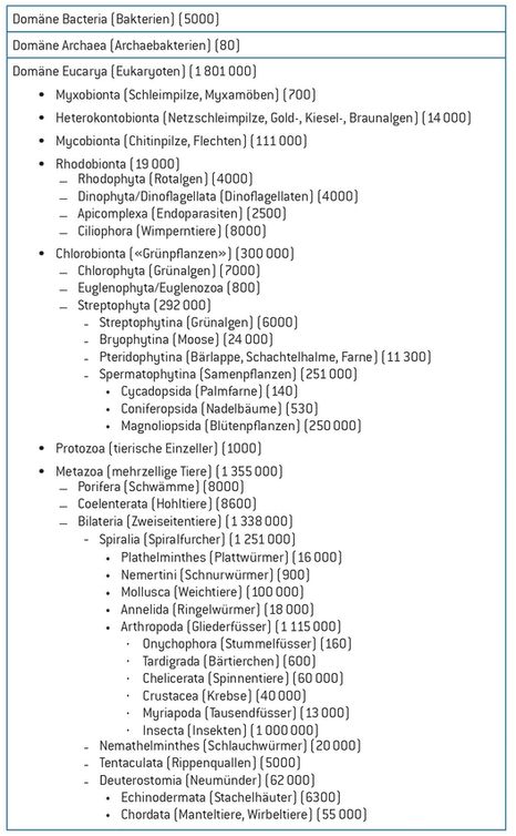 Unsere Kenntnisse über die einzelnen Artengruppen sind sehr unterschiedlich. Große, auffällige Organismen und solche von wirtschaftlicher oder medizinischer Bedeutung (Schädlinge, Krankheitserreger) sind relativ gut erforscht. Riesige Wissenslücken gibt es hingegen bei kleinen, eher unscheinbaren Organismen und solchen, die Lebensräume bewohnen, welche für Menschen schwer zugänglich sind (Boden, Tiefsee, Kronendach des tropischen Regenswaldes). Momentan sind etwa 1,8 Millionen Arten bekannt (Tabelle 3, S. 35). Bei den Pflanzen dürfte ein großer Teil der Arten entdeckt und beschrieben sein. Bei den Mikroorganismen (Prokaryoten), Pilzen und verschiedenen Gruppen von wirbellosen Tieren (Würmern, Milben, Insekten) ist hingegen nur ein Bruchteil der zu erwartenden Arten wissenschaftlich beschrieben. So wird beispielsweise angenommen, dass bisher nur etwa 1 % der Mikroorganismenarten bekannt ist. Die tatsächliche Zahl aller auf der Erde existierenden Arten kann deshalb nur geschätzt oder hochgerechnet werden. Mit unterschiedlichen Ansätzen wurden Schätzwerte von 5 Millionen bis über 100 Millionen Arten ermittelt (Streit 2007, Nentwig et al. 2009). Zur weiten Streuung dieser Schätzwerte tragen einerseits die große Unsicherheit in der Zahl der Mikroorganismen bei und andererseits die vielen Insektenarten, die in den Baumkronen tropischer Regenwälder leben, aber noch weitgehend unbekannt sind. Werden die neueren Schätzungen betrachtet, können wir davon ausgehen, dass auf der Erde die Gesamtzahl der Mikroorganismen, Pilze, Pflanzen und Tiere in der Größenordnung von 10 bis 20 Millionen Arten liegen dürfte.