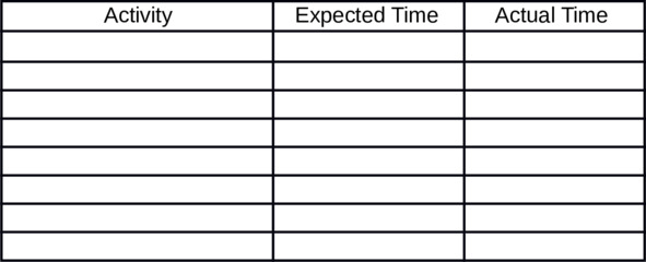 Estimate the amount of time that you think you spend on the various activities listed and enter these in the “expected” row of the summary sheet. Feel free to add any additional categories that might be helpful. Then log your time for one week on an hour by hour basis. When the week is over summarize your time by category for each day, add up the values for all seven days of the week, and write the totals in the “actual” row of the summary sheet.