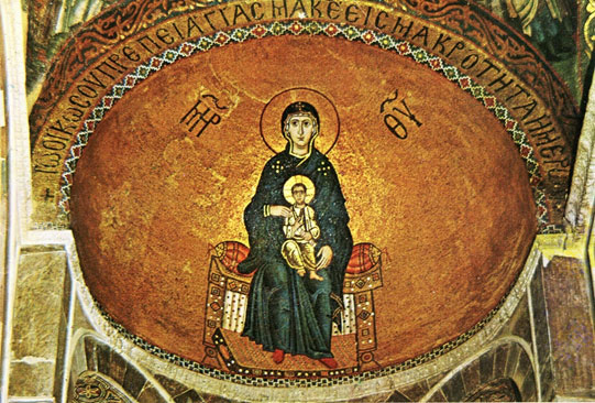 Ил. 16. Богоматерь с Младенцем, восседающая на троне, в конхе апсиды монастыря Осиос Лукас (Греция). Нач. XI в. Мозаика.