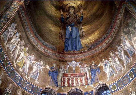 Ниже – конха апсиды, в ней – Богоматерь: либо восседающая на троне с младенцем Христом на руках (ил. 16), либо Оранта (греч. оuραητα, лат. оranta – молящая), представленная в рост, с распростертыми в молитве руками (ил. 17).