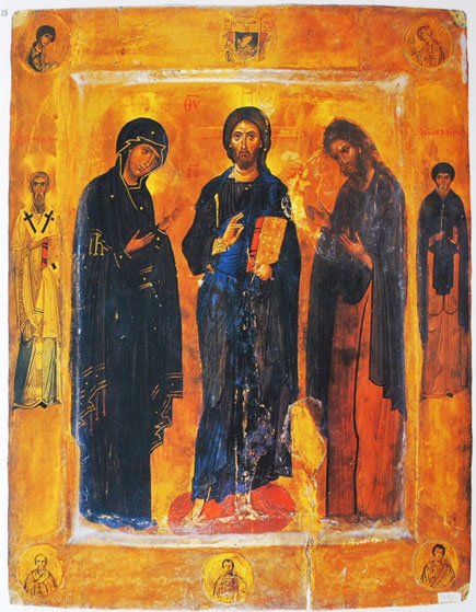 Невысокая алтарная преграда не скрывала алтарь, и интерьер обозревался полностью. В алтаре, а также на столбах, вдоль стен помещаются иконы. На алтарной преграде их устанавливают в один ряд. Здесь иконы Христа, Богоматери и так называемая храмовая икона с изображением святого или события, которому посвящен храм. Здесь же располагали икону (или группу икон) Деисус (греч. δέησις – моление, прошение) (ил. 18): в центре Деисуса – Христос, справа и слева от него – в традиционном жесте молитвенного заступничества Богоматерь и Иоанн Креститель.