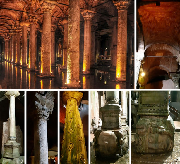 Над водной гладью можно видеть лес колонн, они стоят двенадцатью рядами по 28 в каждом, всего их 336. При строительстве колонны брали из разных античных памятников, и они отличаются друг от друга сортом мрамора, капителями, начальной высотой, способом и деталями обработки (ил. 19.3–5); в основании двух колонн – голова Медузы Горгоны (ил. 19.6–7). Колонны поддерживают сомкнутые своды потолка (ил. 19.2).