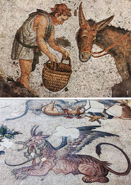 Отметим, что в византийских жилых интерьерах, как и в храмовых, мозаики для украшения сводов, потолков, стен и полов применялись еще более широко, чем в Риме. На месте Большого императорского дворца в ХХ в. обнаружены остатки виртуозно выполненных мозаичных полов. На них представлены разнообразные сценки повседневной жизни (ил. 20.1), охоты, различные животные, в том числе фантастические (ил. 20.2) и др.