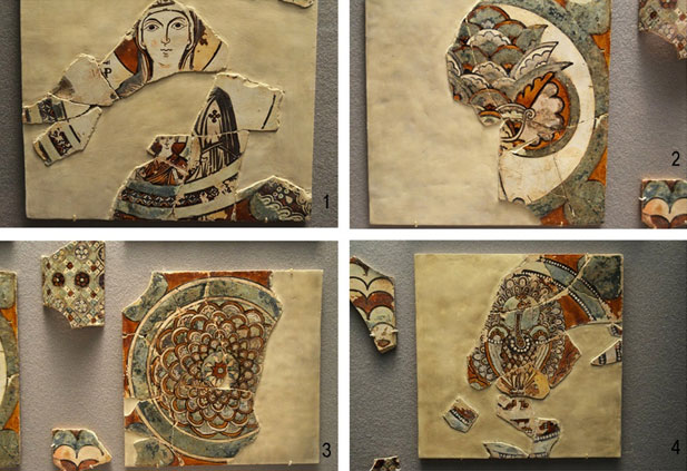 С большой вероятностью можно предполагать, что стены каких-то помещений были облицованы керамическими плитками, плоскими, выпуклыми или вогнутыми. Этот прием появился между IX–XII вв. На плоских плитках из коллекции Лувра (ил. 21) есть изображение Богоматери с Младенцем (ил. 21.1); украшали плитки и декоративными орнаментальными мотивами (ил. 21.2–3); иногда композиция собиралась их нескольких изразцов.