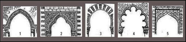 Простая полуциркульная арка в исламских сооружениях, в том числе в интерьерах, встречается довольно редко, чаще исламские арки имеют более декоративные и динамичные формы. При этом те или иные их особенности определялись местными предпочтениями. Стрельчатые арки (ил. 32.1) чаще использовали в Египте, подковообразные (ил. 32.3) – в Испании и в Северной Африке, килевые (килевидные) (ил. 32.5) – в Персии, в Индии. Это также зубчатые (ил. 32.4) арки, в которых арочную кривизну составляют несколько округлых дуг (Испания), или арки в виде трилистника (ил. 32.2) (Египет). Украшаются также обрамления арок, так называемые архивольты; как правило, для этих целей используется орнамент, цвет.