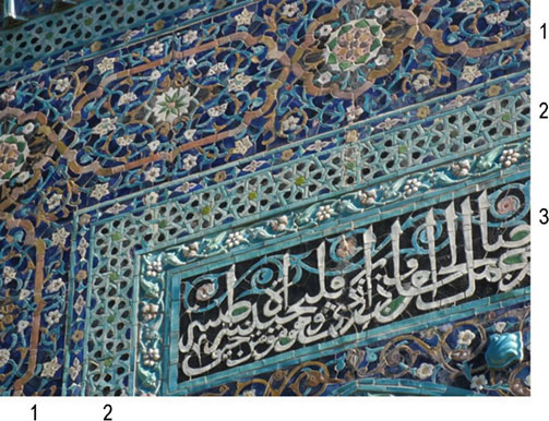Во-первых, растительный, в виде извивающихся в прихотливом узоре естественных и стилизованных стеблей, листьев, цветов, плодов, побегов (ил. 35/1/). Во-вторых, геометрический, представляющий собой по-разному компонующиеся всевозможные геометрические формы и мотивы (ил. 35/2/). И, наконец, абсолютно новый вид орнамента – каллиграфический, которым выполняли священные надписи (изречения из Корана, послания, стихи и др.). Каллиграфические стили менялись, совершенствовались. Они определялись правилами написания букв, их пропорциями, наклоном и др. Например, куфический шрифт – это красивые удлиненные буквы, изящно вплетаемые в общую композиционную канву (ил. 35/3/). Подобные вставки-надписи не только расширяли палитру декорационных средств, но придавали художественно-абстрактной орнаментальной формуле содержательную глубину. Наконец, есть орнаменты, включающие одновременно растительные и геометрические мотивы, в Европе получившие название «арабеска» (итал. arabesco – арабский). В этом орнаменте фрагмент или несколько фрагментов узора «бесконечно» повторяются.