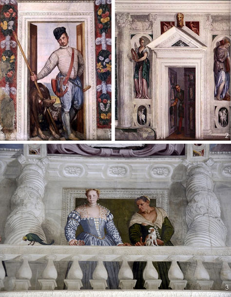 1. Охотник (автопортрет П. Веронезе). 2. Персонаж за приоткрытой дверью. 3. Хозяйка дома с няней и сыном на лоджии наблюдают за гостями. Фрагмент фрески в зале Олимпа