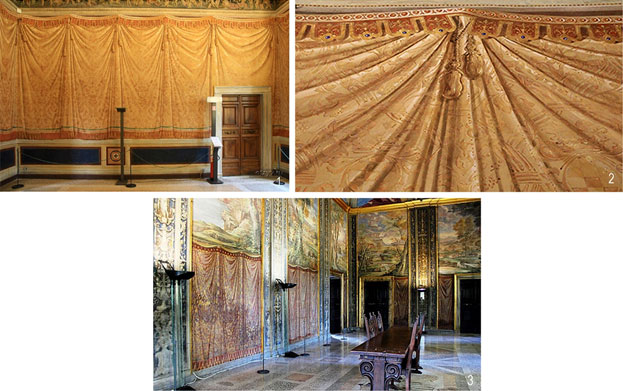 1. Интерьер с росписью «Драпировка стен текстилем». 2. Фрагмент. 3. Вилла Фарнезина в Риме. Арх. Б. Перуцци. 1506–1510 гг.