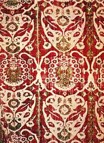 Текстиль в оформлении стен. Возможно, тканные драпировки были не только одним из живописных мотивов, но стены в действительности декорировали подлинным текстилем. При этом возможны два способа. Один способ: полотно регулярно фиксируется на стенной поверхности и слегка провисает между креплениями; примеры подобных решений подсказывал также Древний Рим. Другой способ: гладкое основное поле стены под широким фризом сплошь затягивалось тканью с сохранением необходимых для Ренессанса регулярности и упорядоченности. Подобный прием известен в маньеризме, его унаследует барокко и т. д. Во все времена использование текстиля в убранстве стен относилось к разряду роскошных приемов, поскольку большие красивые ткани, в Ренессансе это парча или бархат с крупным орнаментом (ил. 22), были дороги.